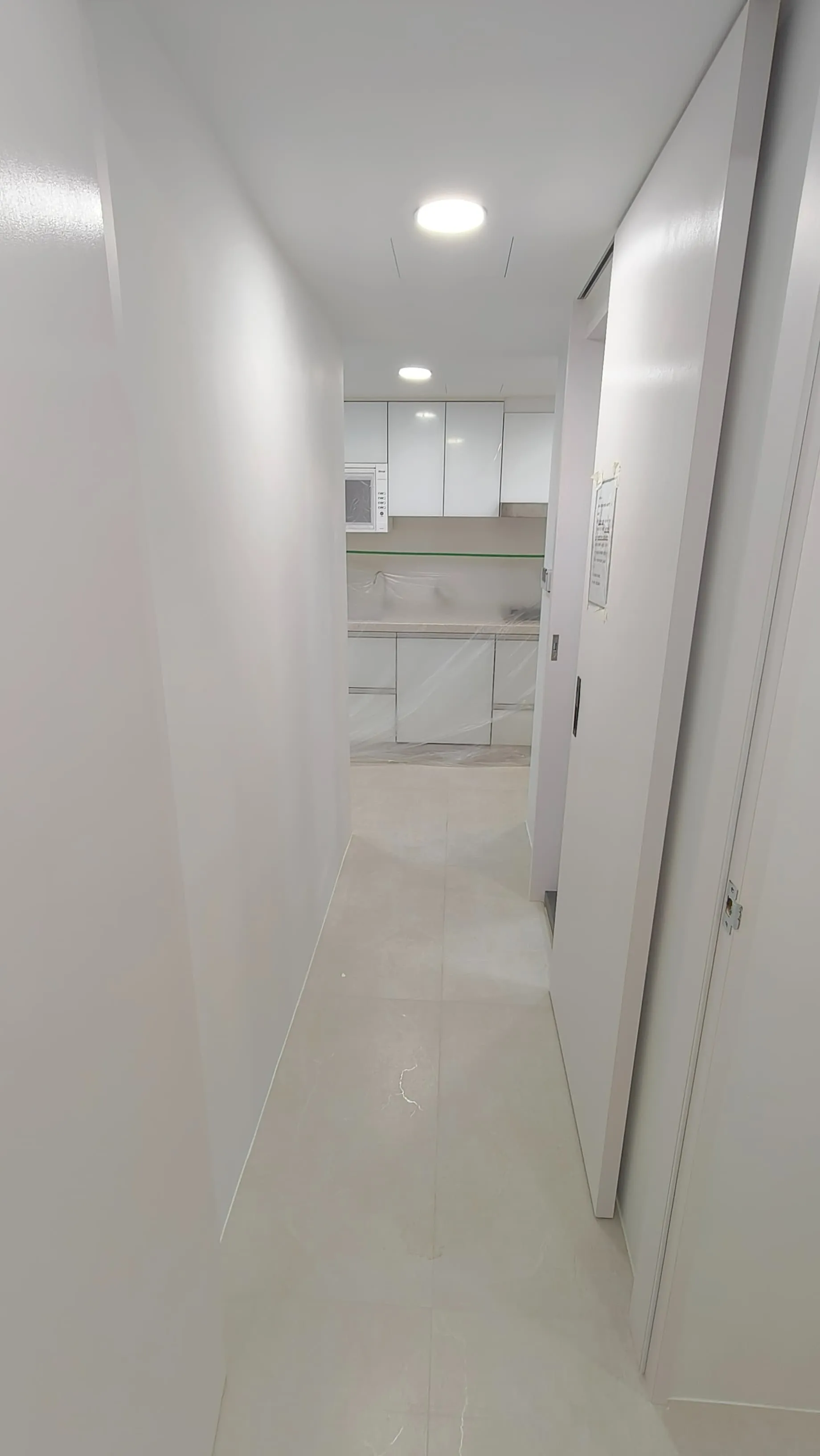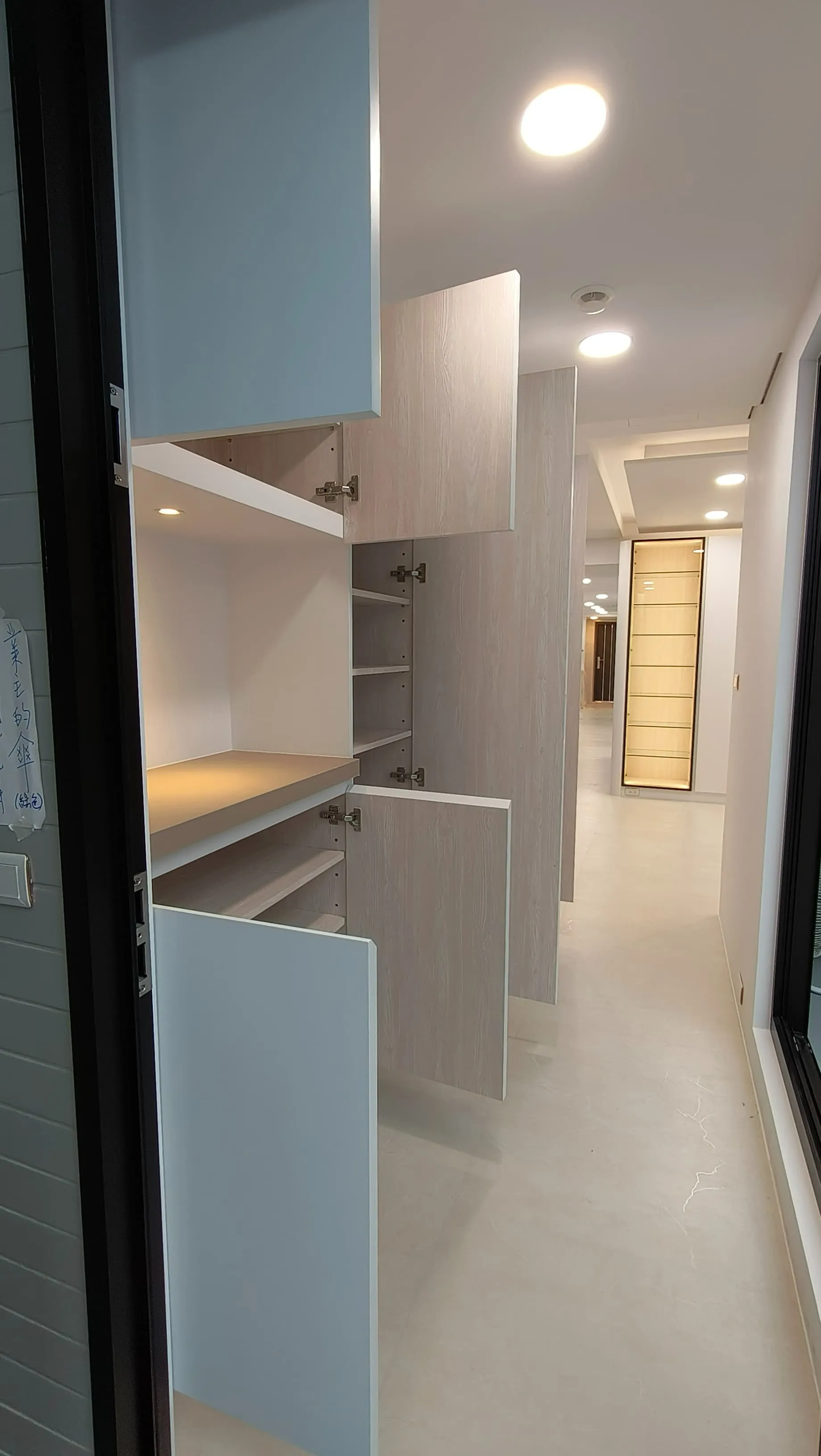 櫃體工程是整個裝修過程中的一大挑戰。木工訂製的櫃體由於設計複雜,耗時較長。原本計劃使用木皮的櫃體門片最終改為冷烤噴漆,這一變更增加了製作難度。噴漆過程中,噴塗的質量與均勻性是關鍵,使用了班傑明摩爾的水性冷烤漆,以確保環保和美觀。